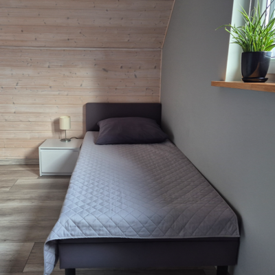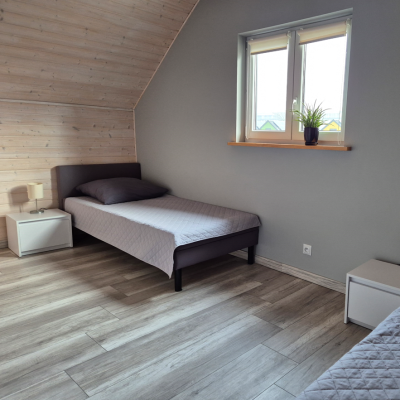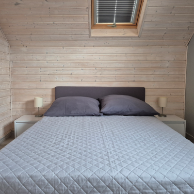 W naszej ofercie posiadamy 4 całoroczne domki letniskowe. Jeden domek murowany z ogrzewaniem gazowym i trzy drewniane z ogrzewaniem elektrycznym. W każdym z domków jest możliwość zakwaterowania maksymalnie 6 osób. Każdy z domków posiada 2 osobne sypialnie na I piętrze. Jedna z sypialni posiada łóżko małżeńskie, a druga dwa jednoosobowe łóżka. Dodatkowo każdy domek posiada dwa miejsca noclegowe w pokoju dziennym na parterze. Domki posiadają zadaszone tarasy z meblami wypoczynkowymi oraz wyposażone są w sprzęt plażowy (2 leżaki, parawan).